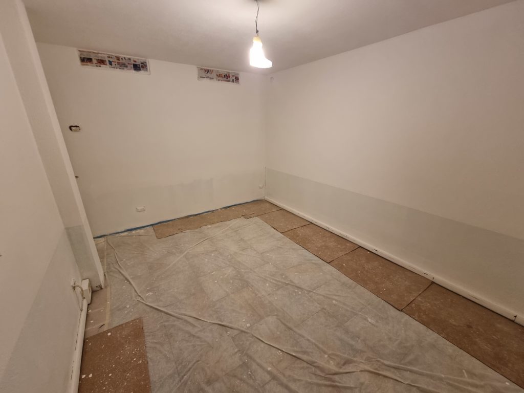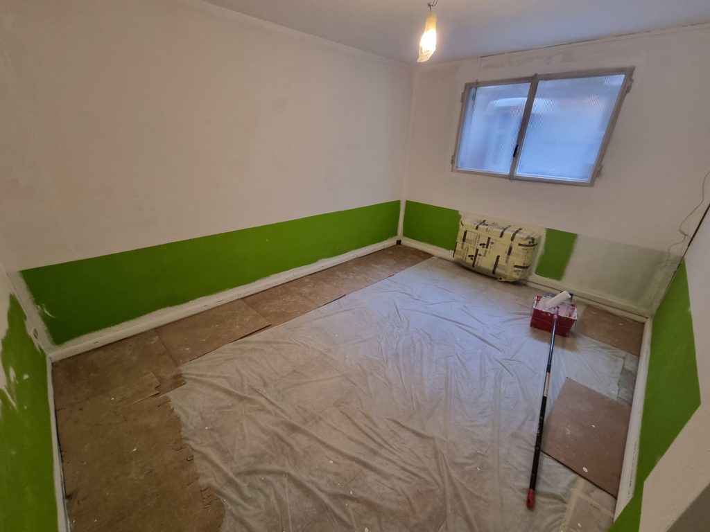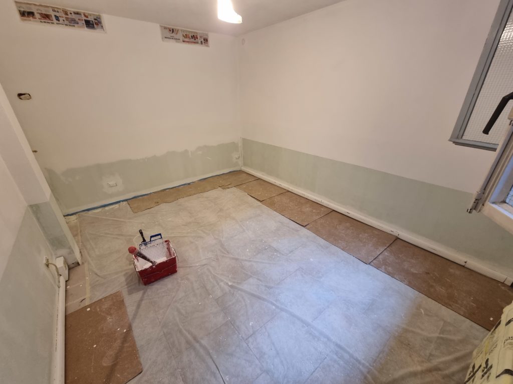 A parte qualche piccolo lavoretto di ri-rasatura sulle giunture della parete in cartongesso, la stanza si presenta in buono stato. Nastratura, carteggiata e spolverata genersle e si parte. La sfida più grande, se così si può definire, sarà far sparire lo stacco fra il verde e il bianco della 0recedente tinteggiatura.