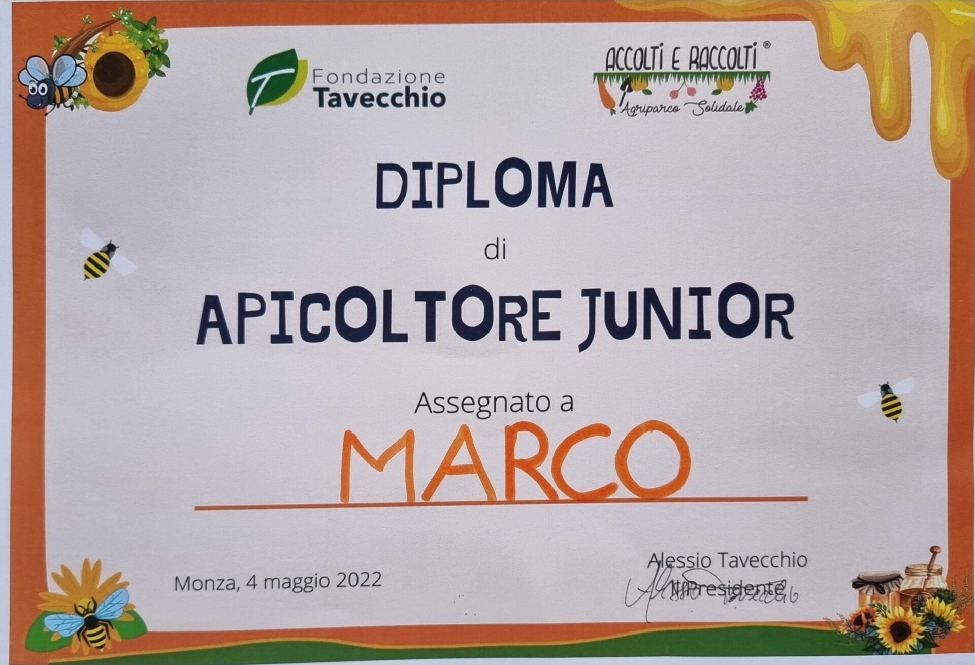 Nel frattempo ecco il diploma di Apicoltore Junior che hai ricevuto – e hai riscoperto quanto è buono il miele gnam-gnam 🍯.