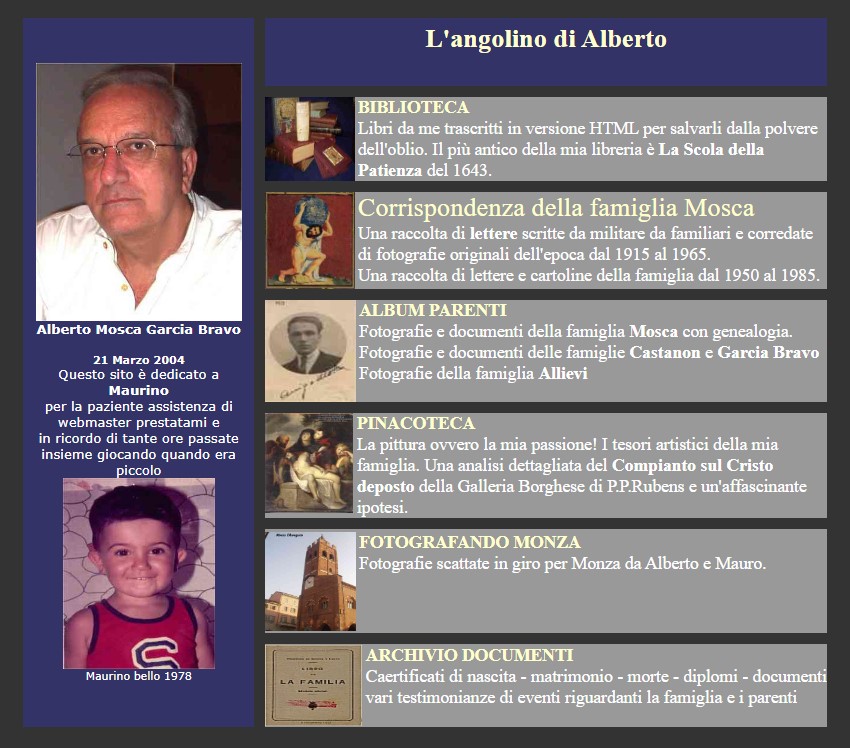 Fu allora che, dalla comunione dei due interessi, suggerii a papà di implementare il suo archivio digitale sotto forma di documenti ipertestuali, vista la loro caratteristica testuale e multi-mediale. Papà si mise di buzzo buono a studiare l’Html e in breve tempo nacque “L’angolino di Alberto” una raccolta di documenti memorizzata sul computer di famiglia e manutenuta anche dopo la nascita di questo sito.