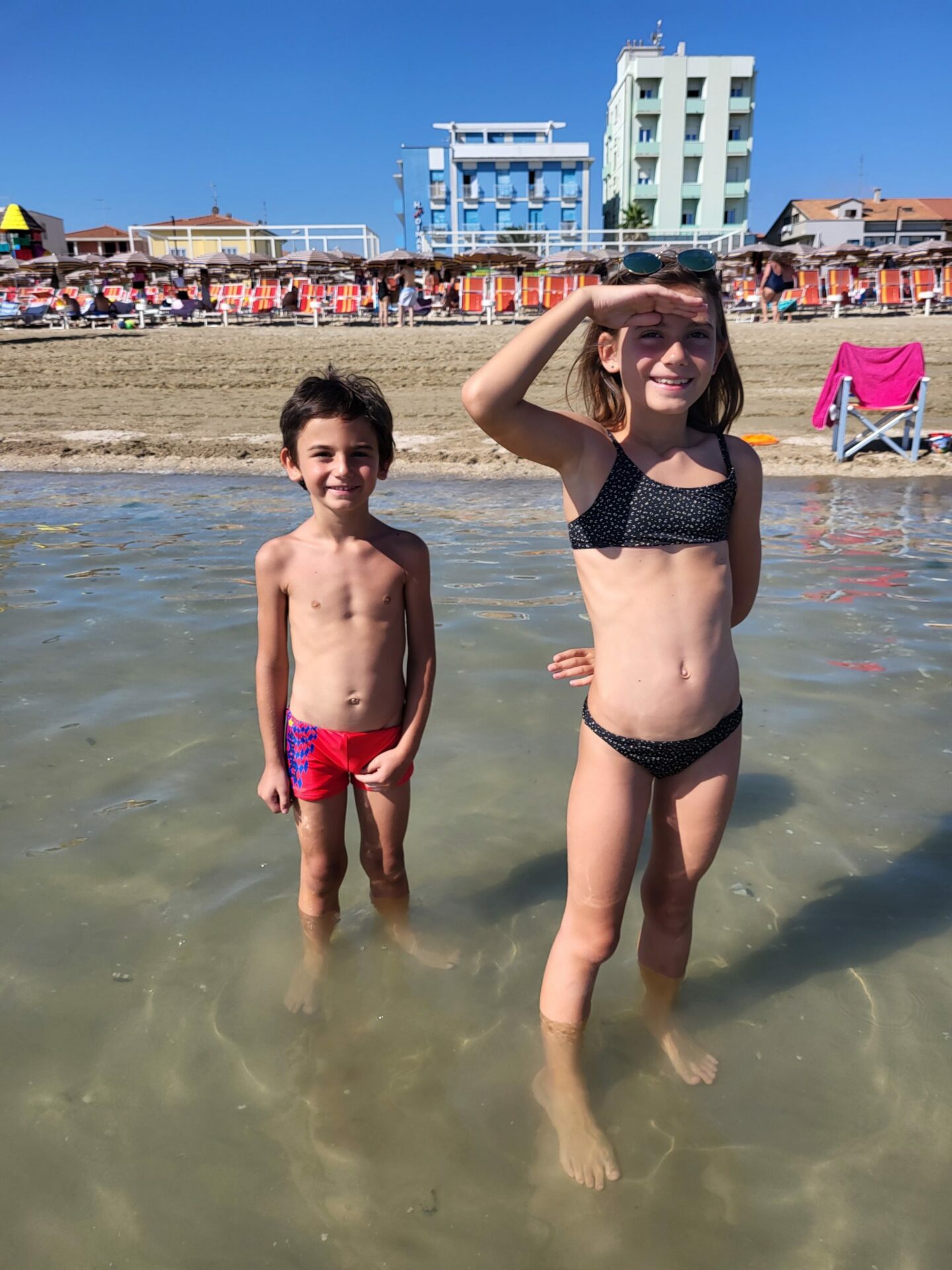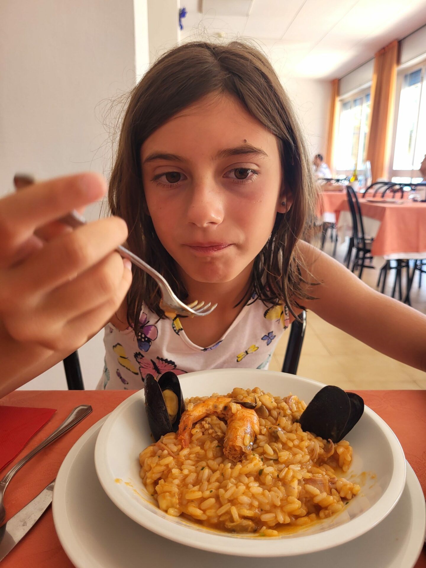 Siamo in camera, dopo un pasto abbondante e prima di tornare in spiaggia. Marco ha mangiato lasagne (e ha fatto il bis!) e noi un risottino alla pescatora buonissimo!