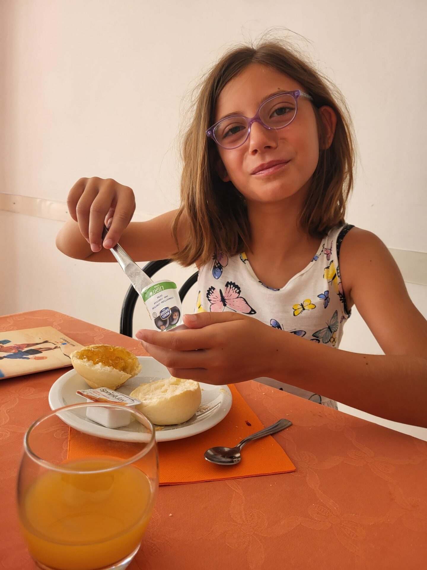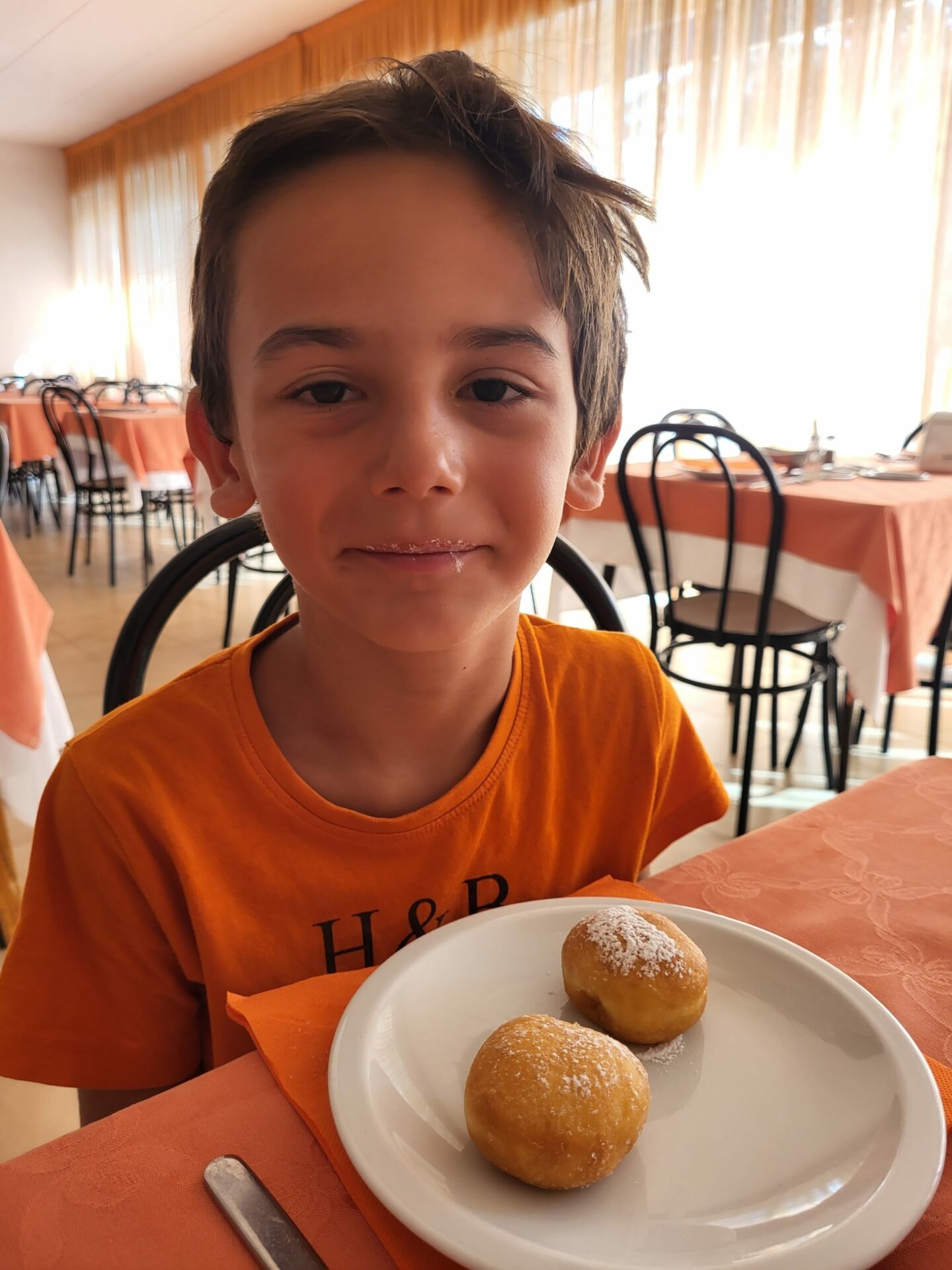 Eccoci, è martedì, e inizia il nostro quinto giorno di vacanza! Anche oggi è una bellissima giornata, anche se c’è un filo di vento… ma a voi piace, perché probabilmente il mare nel pomeriggio sarà mosso e a voi piace tuffarvici in mezzo! Ecco due foto della colazione appena fatta… ed ora si va in spiaggia! Ah… aggiungo la foto di quanto eravate belli questa mattina al risveglio!