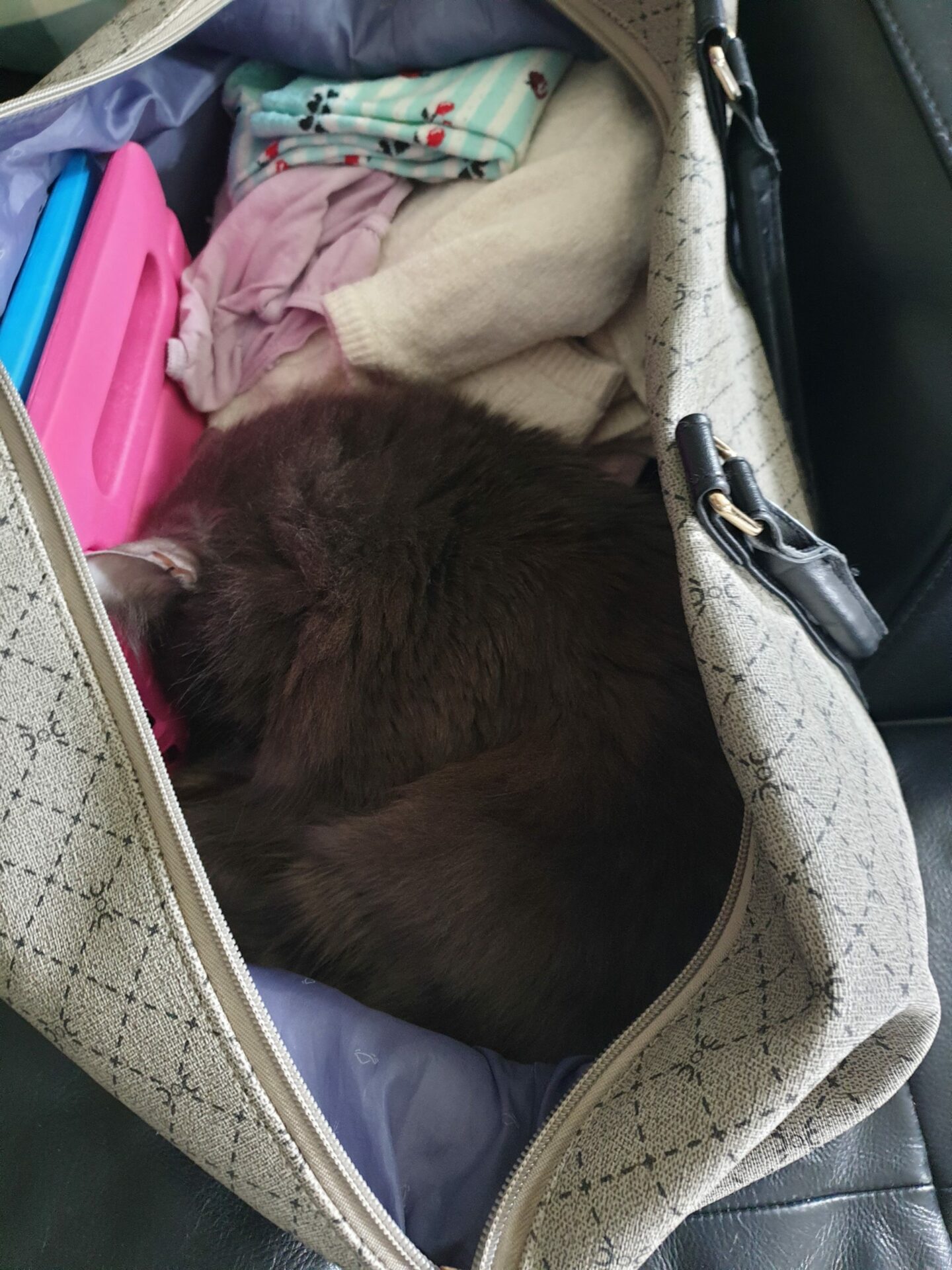 Siete via solo da qualche ora e già vi penso, probabilmente tutti e 3 “accucciolati” nel lettone. Oggi mentre vi preparavo la borsa, Cagliostro ha ben pensato di infilarcisi dentro a dormire… eccolo qua!